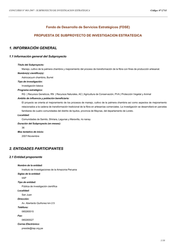 El proyecto se orienta al mejoramiento de los procesos de manejo, cultivo de la palmera chambira así como aspectos de mejoramiento relacionados a la cadena de transformación tradicional de la fibra en artesanías comerciales. La investigación se desarrollará en parcelas familiares de cuatro comunidades del distrito de Iquitos, provincia de Maynas, del departamento de Loreto.