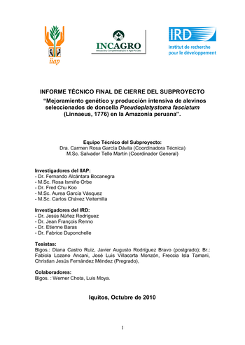 Mejoramiento genético y producción intensiva de alevinos seleccionados de doncella Pseudoplatystoma fasciatum (Linnaeus, 1776) en la Amazonía peruana