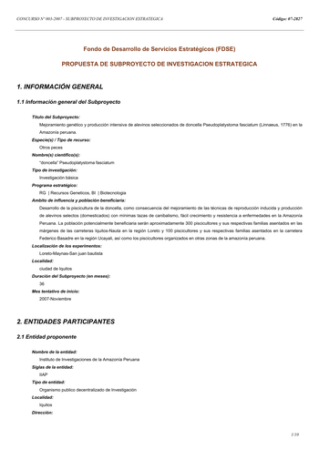 Desarrollo de la piscicultura de la doncella, como consecuencia del mejoramiento de las técnicas de reproducción inducida y producción de alevinos selectos (domesticados) con mínimas tazas de canibalismo, fácil crecimiento y resistencia a enfermedades en la Amazonía Peruana. La población potencialmente beneficiaria serán aproximadamente 300 piscicultores y sus respectivas familias asentados en las márgenes de las carreteras Iquitos-Nauta en la región Loreto y 100 piscicultores y sus respectivas familias asentados en la carretera Federico Basadre en la región Ucayali, así como los piscicultores organizados en otras zonas de la amazonía peruana.