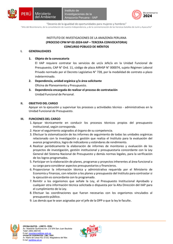 EL IIAP REQUIERE CONTRATAR LOS SERVICIOS DE UN/A JEFE/A EN LA UNIDAD FUNCIONAL DE PRESUPUESTO, CAP N° ORD. 11, CÓDIGO DE PLAZA AIRHSP N° 000074, SUJETO RÉGIMEN LABORAL PRIVADO NORMADO POR EL DECRETO LEGISLATIVO N° 728, POR LA MODALIDAD DE CONTRATO A PLAZO INDETERMINADO.