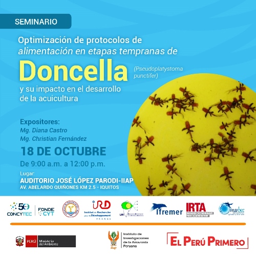 SEMINARIO: Optimización de protocolos de alimentación en etapas tempranas de doncella Pseudoplatystoma punctifer y su impacto en el desarrollo de la acuicultura. Se entregarán certificados a todos los participantes.